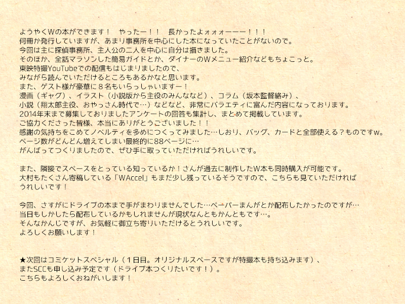 新刊のW本も「楽しみにしていた」と仰ってくださる方が多く、改めてWの人気に嬉しくなります。もうずーっと作ってるような感じだったのでw、自分では(ゲスト様のページは素晴らしいのですが!)自分のところが面白いのかどうなのかもよくわからず……。